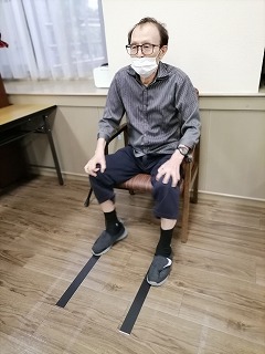 中央位置から黒テープの外側に足を広げ戻します。時間内に何回できるかが勝負です。